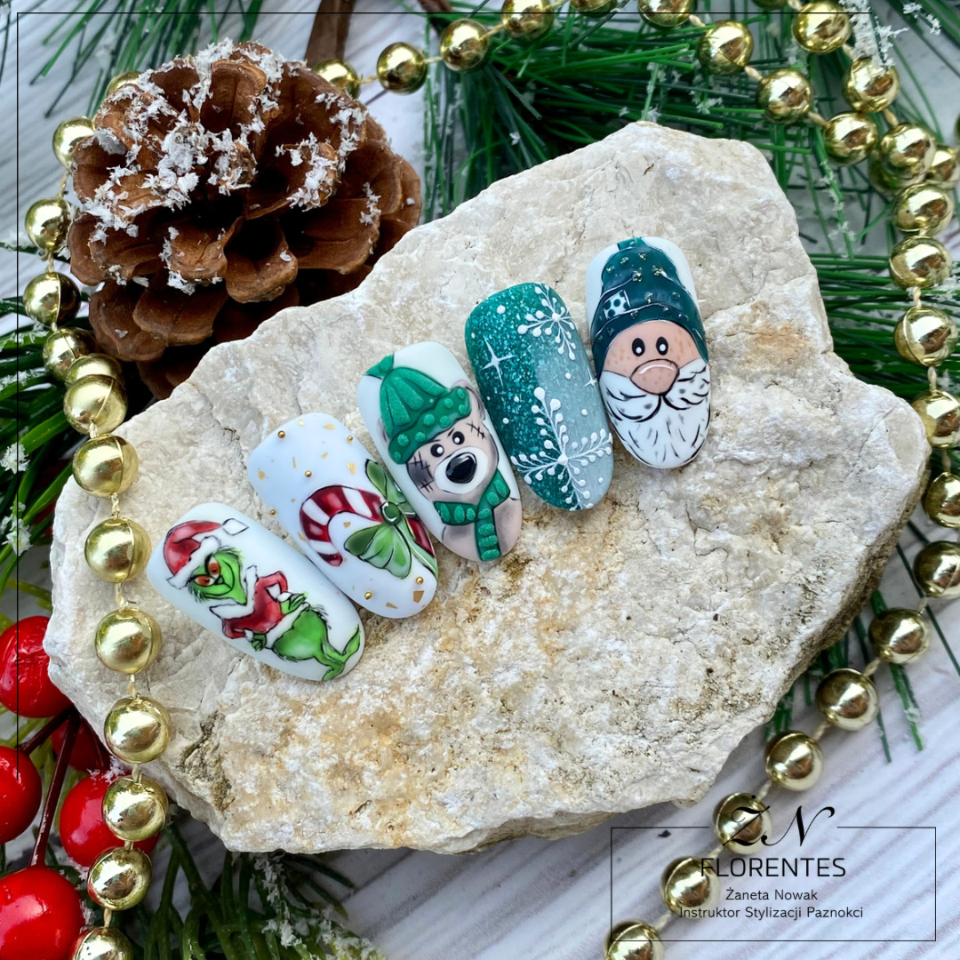 „Święta z Grinchem” to mix zdobień zimowo-świątecznych,  po które sięga 90 % klientek. Szkolenie to uczy technik i zdobień, które powinna znać każda stylistka by móc sprostać potrzebom pań jakie czekają na nas przed świętami. Pamiętaj, że każdą propozycję możesz wykonać w dowolnym kolorze dzięki czemu możesz tworzyć niekończące się inspiracje.