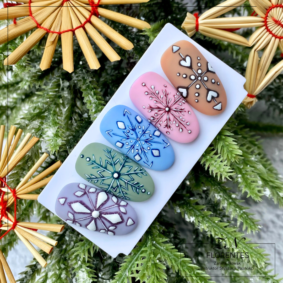 Śnieżynki to zdobienie, którego nie może zabraknąć w żadnym salonie w okresie zimowo – świątecznym. Są one wykorzystywane na wszystkie możliwe sposoby i we wszystkich możliwych wersjach. A pomysł z tego szkolenia szczególnie kradnie serca klientek przez wzgląd na wprowadzony w nim brokat oraz elementy sweterków.